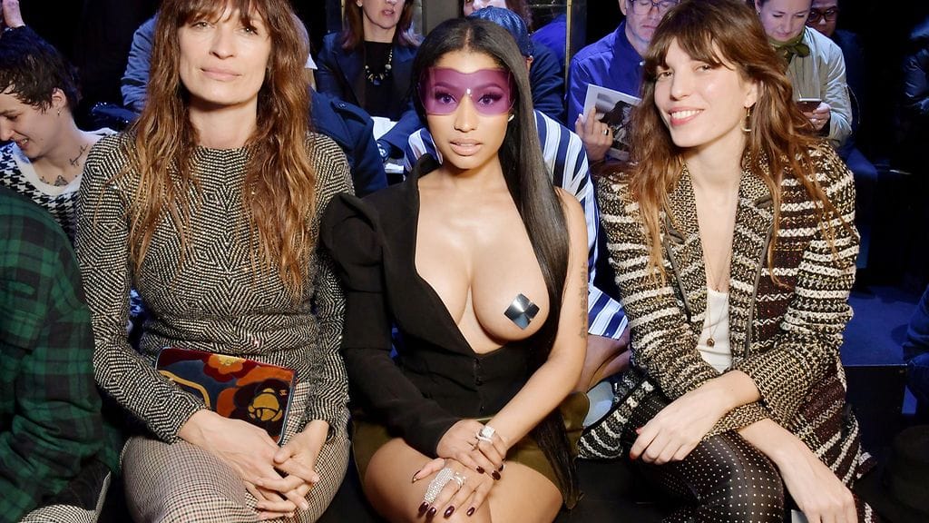 Minaj nähtiin muotinäytöksen eturivissä asussa, joka paljasti toisen rinnan miltei kokonaan. Avoimeen jakkuun Minaj yhdisti näyttävät aurinkolasit ja metallinhohtoiset shortsit.