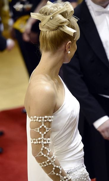 Voutilaisen selkämys on oli kaunis ja avonainen. Voutilaisen koko käden kattava käsikoru sointui loistavasti futuristiuutta henkivään asuun.