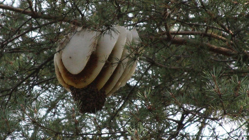 – Se näyttää melkein mehiläispesän sisällöltä. Siinä on parvi lähtenyt pesästä ja paremman paikan puutteessa ne ovat päättäneet rakentaa pesän männyn oksalle.