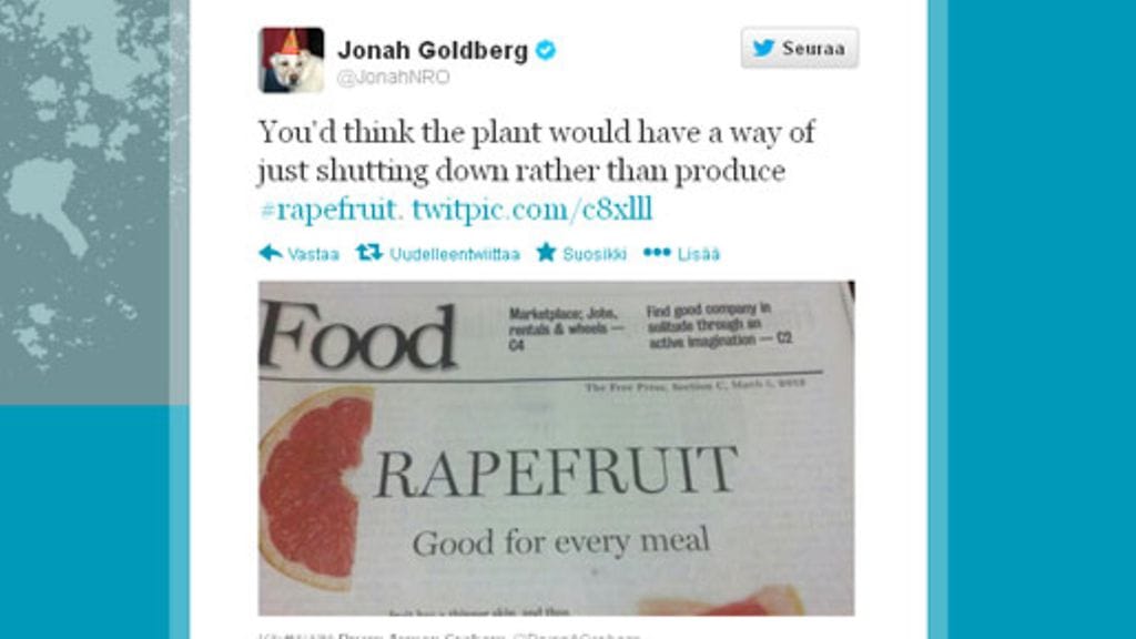 Minnesotan paikkallislehti Free Press julkaisi torstain lehtensä ruokaosiossa jutun greippihedelmästä. Jutun otsikko mainosti greipin olevan hyvä hedelmä jokaiselle päivän aterialle. Otsikon asettelu ja g-kirjaimen korvaaminen hedelmälohkolla ei kuitenkaan onnistunut ihan toivotulla tavalla. Lukijat hieraisivat silmiään, kun ruokasivujen pääotsikkona komeili isolla fontilla "RAPEFRUIT" englanninkielisen greippiä tarkoittavan grapefruit -sanan sijaan. Englanninkielen sana "rape" tarkoittaa raiskausta.