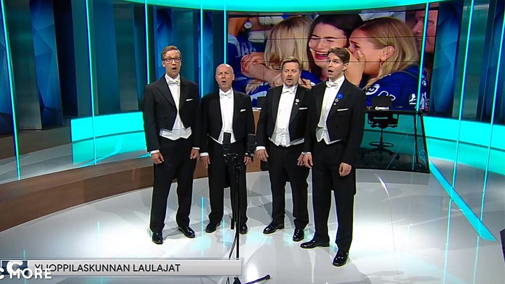 Ylioppilaskunnan laulajat päättivät C Moren MM-kisalähetykset tunteikkaalla esityksellä Leijonien maailmanmestaruuden ratkettua.