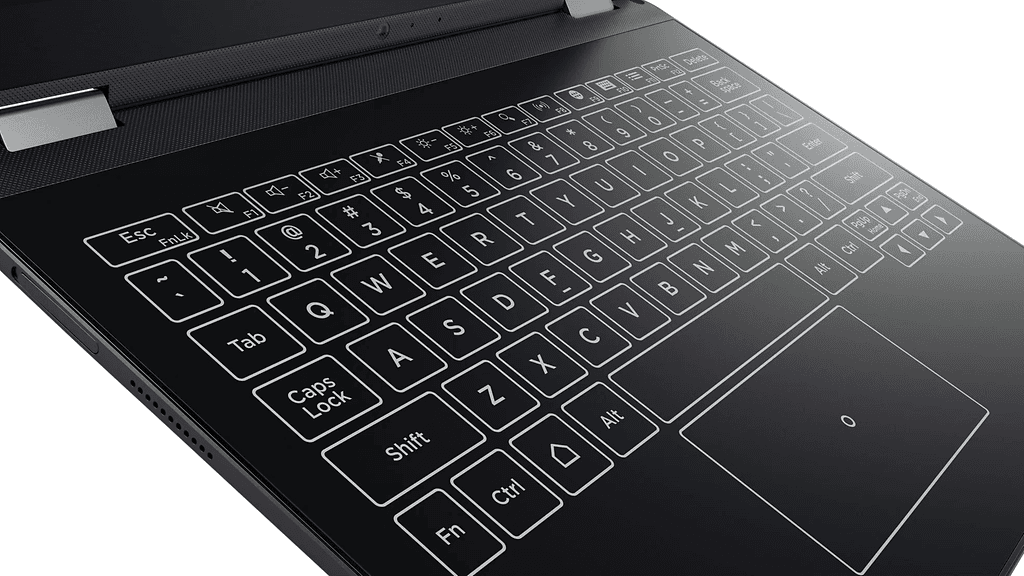 Nyt Lenovo on esitellyt uuden edullisemman Yoga A12:n, jossa myös on erikoinen näppäimistöksi tarvittaessa muuntuva Halo Keyboard -kosketuslevy. Tasapintainen, kosketusherkkä näppäimistö tarjoaa värinävasteen painalluksiin. Lenovon mukaan näppäimistöä on parannettu ja ohennettu sen ensimmäisestä versiosta.