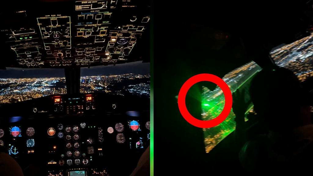 Koneen valmisteutuessa laskeutumiseen, ilmestyi maan tasolta kirkas vihreä laser-valo, joka häikäisi pahasti koneen lentäjän.