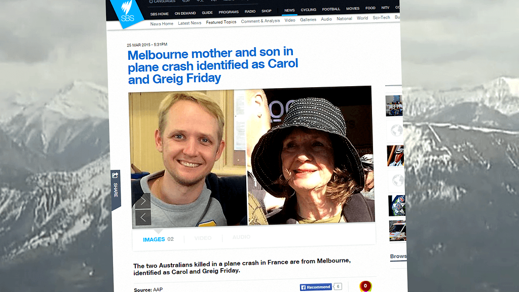 Eilisessä Germanwingsin lentoturmassa menehtyi myös kaksi australialaista. Nuorimies oli saapunut Eurooppaan opettamaan englantia ja vietti lomaa äitinsä kanssa. Äiti täytti päivää ennen turmaa 68 vuotta, uutisoi australialainen SBS-tv-kanava.