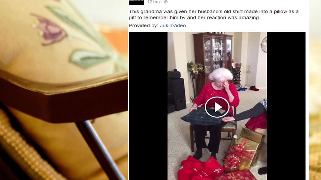 Iäkäs nainen reagoi kyynelin, kun hän sai lahjaksi edesmenneen aviomiehensä paidasta tehdyn tyynyn.