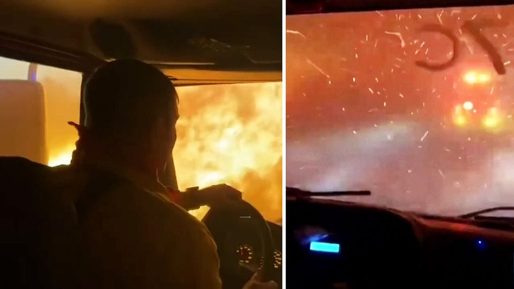 Yhdysvalloissa Nevadan osavaltiossa kuvatulla videolla voi nähdä pelastushenkilökunnan pakomatkan tulen saartamalla tiellä.