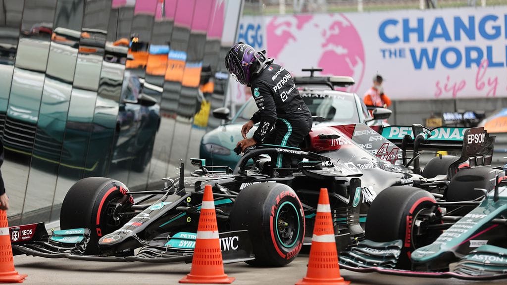 Kaiken lisäksi Hamilton rysäytti varikolle tullessa seinään, rikkoen autoaan. Tämä taas johti siihen, että perässä tullut Valtteri Bottas joutui odottelemaan omaa renkaiden vaihtoaan.