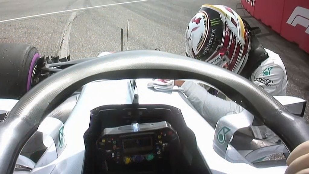 Lopulta Hamilton joutui toteamaan aika-ajon mentyä mönkään, ja pettynyt tähtikuski polvistui autonsa viereen radan varteen. Hetken päästä tv-kuvaan saatiin hidastus, jossa britti rymisteli voimakkaasti kanttareiden yli Mercedes-katsomon kohdalla.