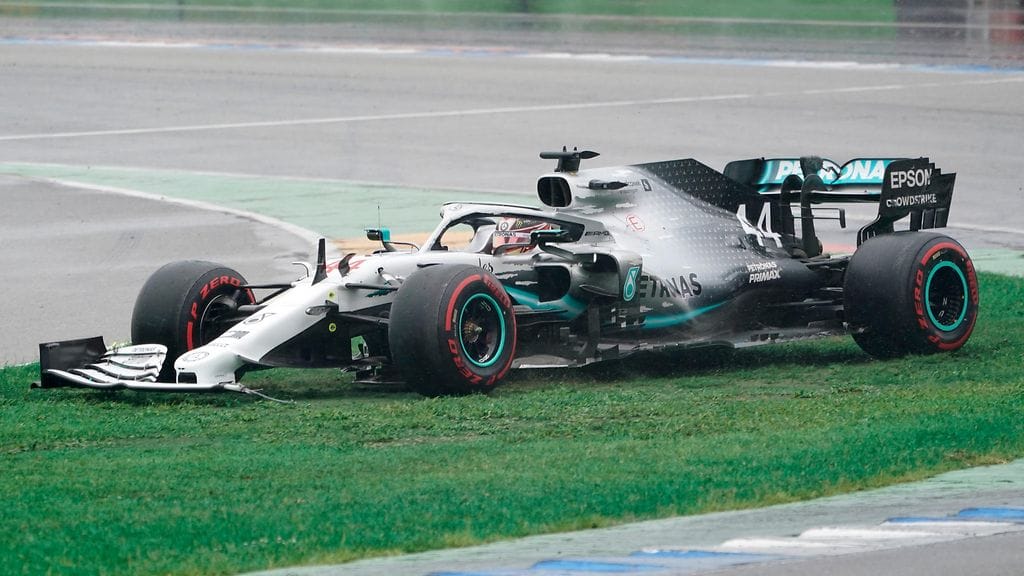 Hamilton kisa meni pilalle lopullisesti, kun hän pyörähti vauhdilla radan avausmutkassa. Hamilton vältti vain vaivoin osuman seinään ja pystyi vielä jatkamaan kisaa rengasta hipoen.