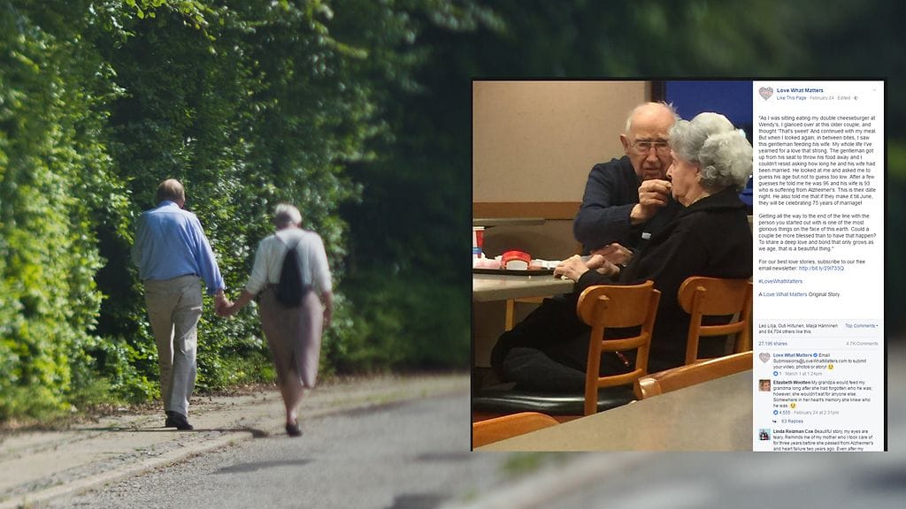 Love What Matters -sivuston kuvassa mies syöttää vaimoaan. Kuvan sivustolle lähettänyt henkilö kertoo olleensa pikaruokalassa syömässä, kun hän huomasi vanhan parin pöydässä.
