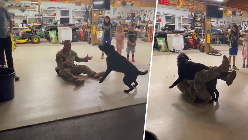 Perhe jakoi koskettavan hetken, kun kahdeksan kuukautta armeijan komennuksella ollut Dennis Flynn Jr palasi kotiin. Erityisesti perheen koira, labradorinnoutaja Max ei meinannut pysyä nahoissaan päästessään taas lempi-ihmisensä rapsuteltavaksi.
