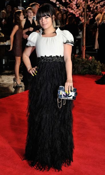 Laulaja ja lauluntekijä Lily Allen, 28, edusti "Saving Mr. Banks" -elokuvan ensi-illassa Lontoossa lumikkimaisessa asukokonaisuudessa. Allen oli valinnut ylleen mustaa ja valkoista yhdistelleen iltapuvun, jonka alaosa oli harsomaisesti kerrostettu. Iltapuvussa oli myös korkealle nostettu vyötärö, jota puvun köynnösmäinen vyö korosti.