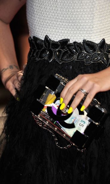 Puvun yläosan puhvimaiset hihat ja neliömäinen kaula-aukko loivat asuun menneen ajan vivahteen. Modernia särmikkyyttä kokonaisuuteen toivat Allenin keltaisiksi lakatut kynnet ja Chanelin pikkulaukku.