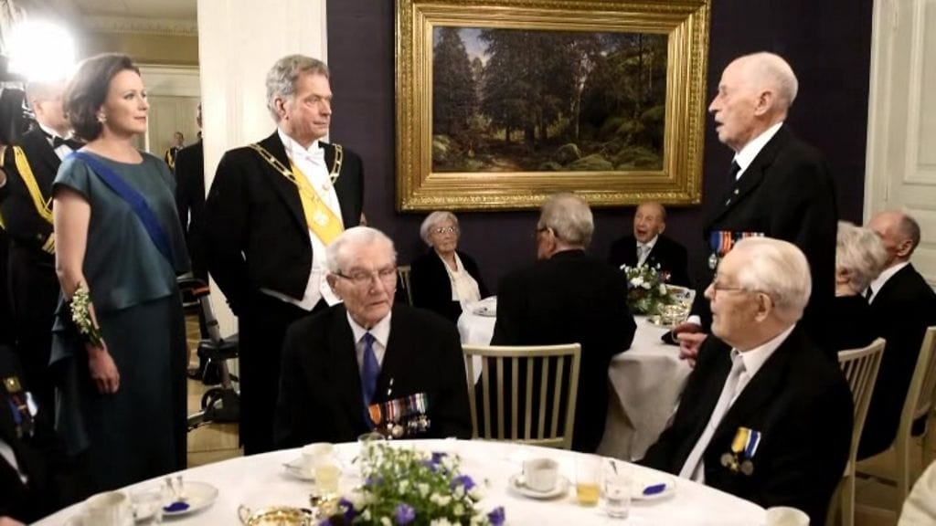 Linnan juhlien kättelyiden jälkeen presidenttipari Sauli Niinistö ja Jenni Haukio siirtyivät yhteiseen kahvihetkeen sotaveteraanien kanssa.