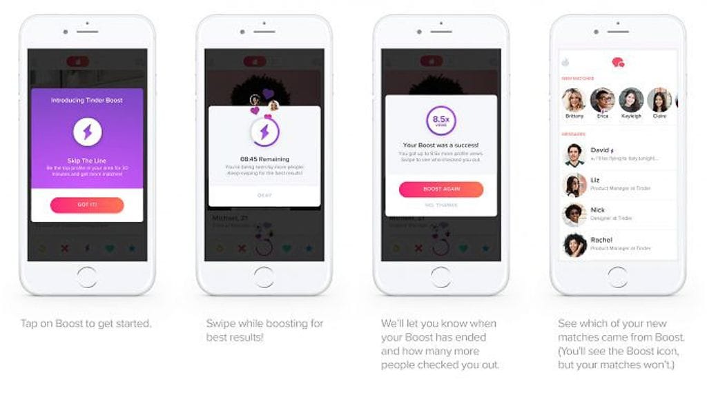 Tinder Boost nostaa käyttäjän profiilin oman alueen profiilien kärkipäähän puolen tunnin ajaksi, jolloinuseampi seuranhakija näkee profiilin. Tinderin mukaan näkyvyys voi jopa 10-kertaistua kun Boost on käytössä. Näkyvyys taas tarkoittaa enemmän matchejä, eli pareja, arvellaan Tinderissä.