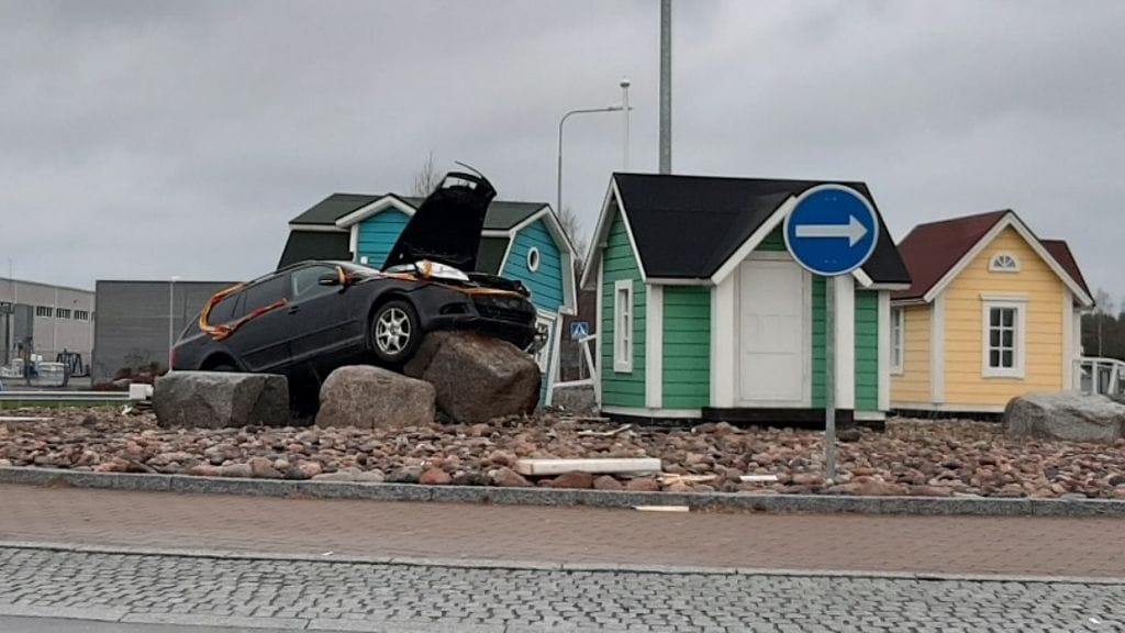 Normaalisti idyllisen liikenneympyrän keskellä seisoa tönöttää koristeena pieniä mökkejä, mutta nyt ne olivat saaneet seurakseen myös sangen erikoisesti "pysäköidyn" auton.