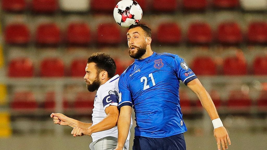 85' Simon Skrabb puskee päät yhteen Kosovon Rrahmanin kanssa. Suomalaispelaajan otsaan tulee verta vuotava haava.