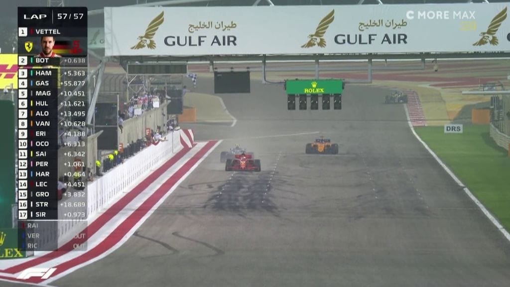 Kierros 11/57: Vettelin ero Bottakseen jo kolme sekuntia samalla kun Strollin etusiipi on hajalla. Stroll varikolle sijalta 15 ja uusi etusiipi kanadalaiselle. Hän putoaa sijalle 18.