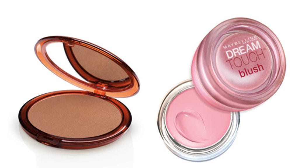 2. Kim leikkii mielellään valoilla ja varjoilla. Kun olet levittänyt valovärin, on vuorossa varjostus. Ota suuri suti ja levitä aurinkopuuteria runsaasti ohimolle ja leuan alle sekä hiukan myös poskiluun alle. Varjosta myös nenänvarren molemmat puolet. Hehkua kasvoille saat, kun levität vielä poskipunaa poskipään korkeimpaan kohtaan häivyttäen korvista suupieliin päin. Korosta rohkeasti myös etumustasi Kimin tapaan ja sudi aurinkopuuteria rintojen väliin.
