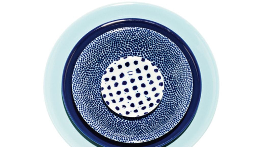 Vaaleansininen lautanen 40 euroa, tummansininen 33 euroa, sinipohjainen 31 euroa ja pieni valkopohjainen 24 euroa, Armas Design.