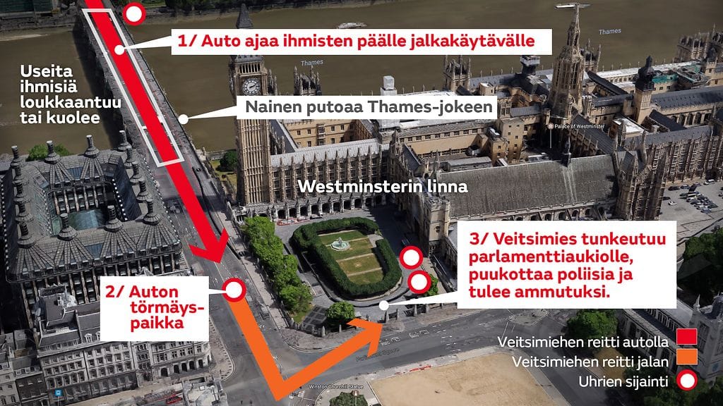 Lontoon eilisen iskun uhriluku on tarkentunut kolmeen: uhreista yksi on poliisi ja kaksi on siviilejä. Myös hyökkääjä kuoli poliisin ammuttua hänet. Sairaalahoidossa on 29 iskussa haavoittunutta, joista seitsemän tila on kriittinen. Terrori-isku tehtiin keskellä vilkasliikenteistä iltapäivää kaupungin tunnetuimman maamerkin luona.