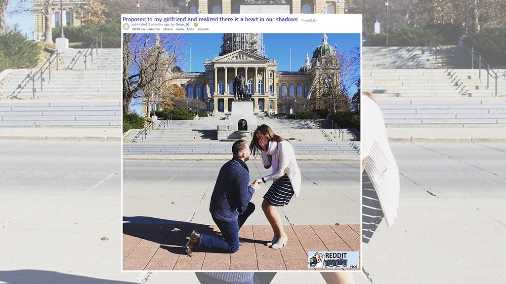 Amerikkalaisparin kihlakuvasta tuli tavanomaistakin koskettavampi, kiitos aurinkoisen sään. Kun Ryan Moon kosi Haley Smithiä ulkona, parin varjojen väliin muodostui maahan pikkuinen sydän, kertoo Northjersey.com.