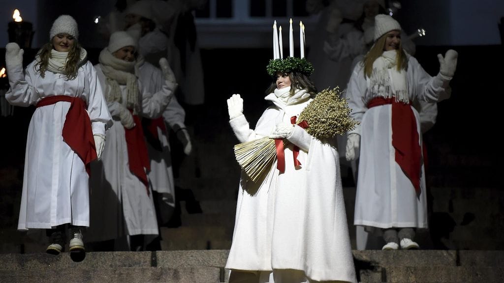 Perinteeseen kuuluu valoa talven pimeyteen tuova Lucia-neito, joka on pukeutunut valkoiseen kaapuun, punaiseen vyöhön ja kynttiläkruunuun.