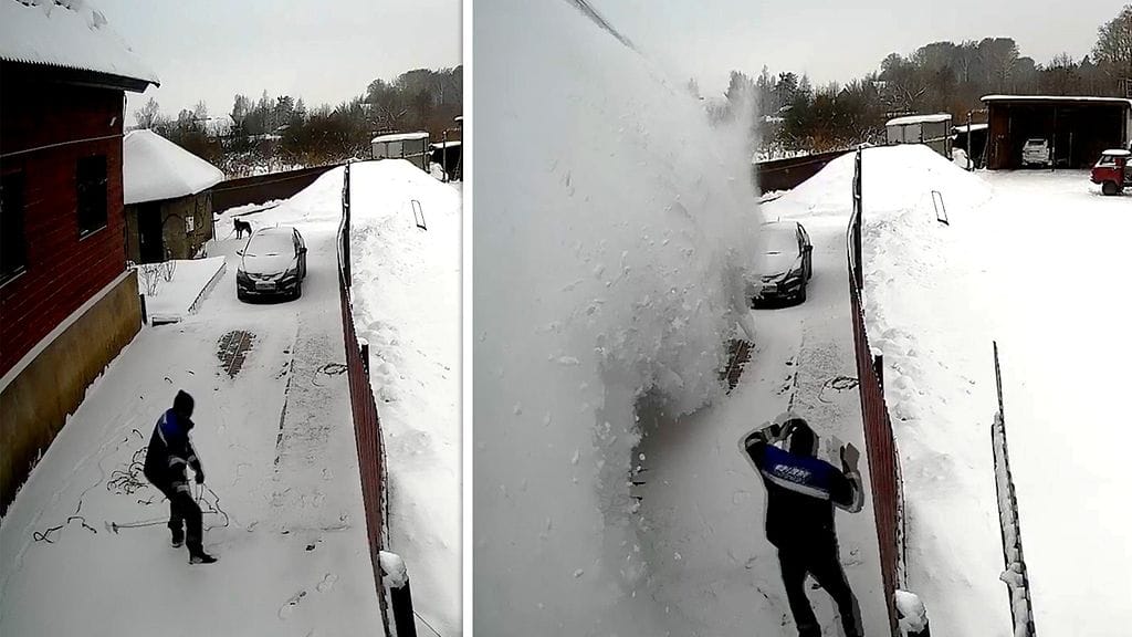 Mies ei kerennyt poistua tieltä, kun lumimassa vyöryi vaarallisesti miehen päälle. Miehellä oli onnea matkassa, sillä hän selvisi ilman vammoja.