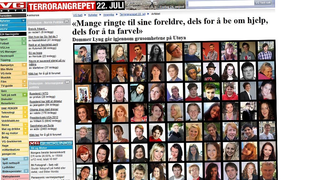 - Jotkut uhrien omaiset kuuntelevat ilmeisen järkyttneinä tuomion yksityiskohtia. Tuomari luettelee kaikkien Utöyan saaren kuolonuhrien nimet ja vammat joita he saivat Breivikin luodeista. Silloin tällöin joku omainen itkee hiljaa, ja vieressä istuvat lohduttavat häntä.