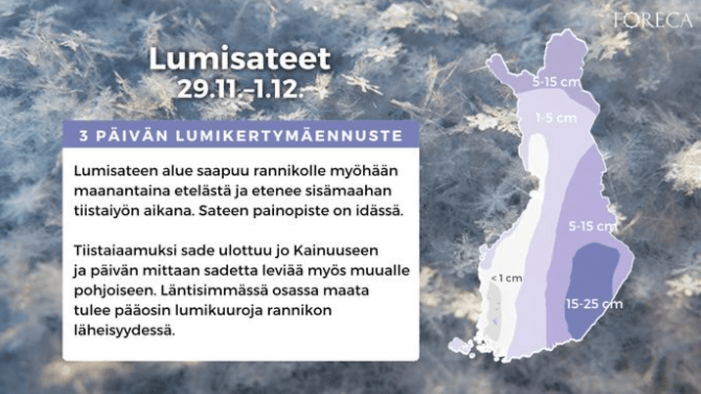 Forecan meteorologi Jenna Salminen kertoo sääpalvelun blogissa, että runsasta lumisadetta voi tulla myös maan eteläosan itäpuoliskollakin.