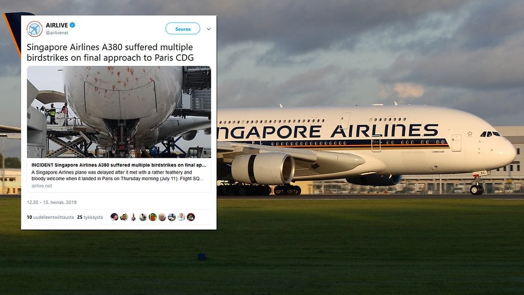 Singapore Airlinesin Airbus A380 -matkustajalentokone sai verisen tervetulotoivotuksen laskeutuessaan Pariisin Charles de Gaullen lentoasemalle viime viikolla.