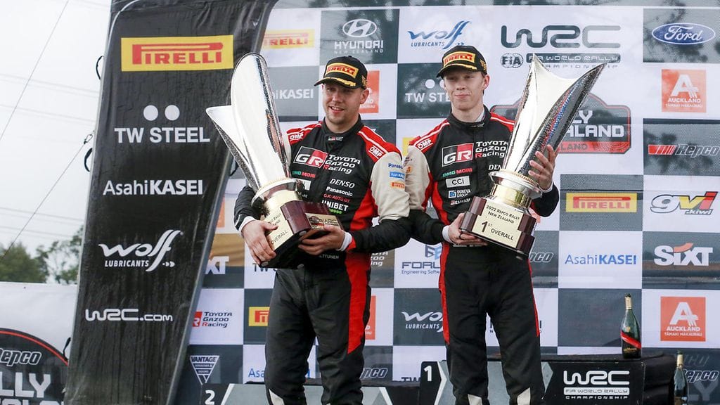 Rallin maailmanmestaruuden voittanut Kalle Rovanperä jakaa tunnustusta hänen kartanlukijanaan toimivalle Jonne Halttuselle.