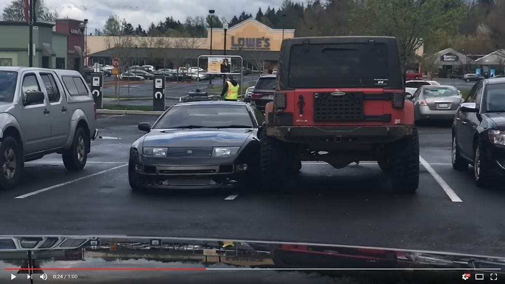 Videolla nähtävä Jeep-kuski päätti antaa opetuksen huolimattomasti pysäköidyn Nissanin kuljettajalle. Hän hivutti autonsa niin lähelle Nissanin kylkeä, että kuljettajan olisi hypättävä sisään apukuskin puolelta.