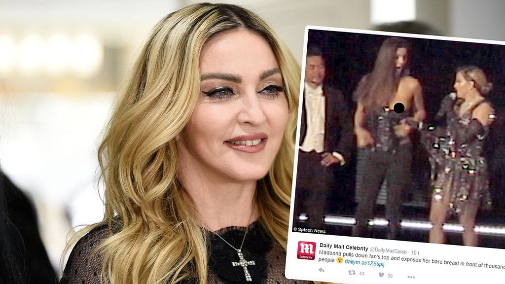 Popkuningatar Madonna on tehnyt lavalla uransa aikana vaikka ja mitä. Tällä kertaa 57-vuotias laulaja vetäisi faninsa paidan alas ja paljasti tämän rinnan tuhatpäisen yleisön edessä Australiassa torstai-iltana. Tähti on parhaillaan Rebel Heart -kiertueella.