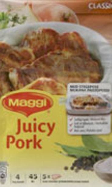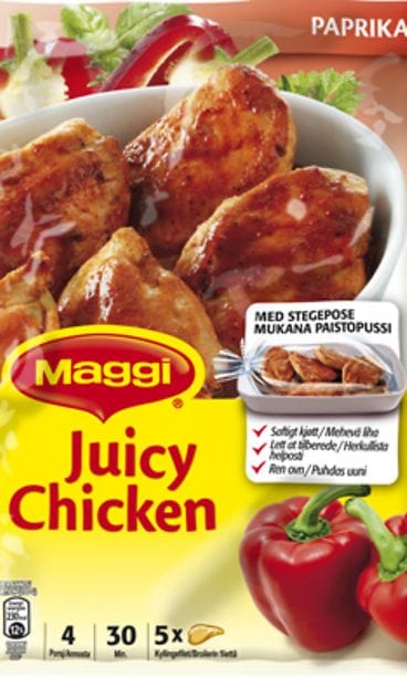 MAGGI Juicy tekee arjesta mehevää, maukasta ja helppoa. Laita maustamaton kana tai liha MAGGI Juicy -paistopussiin, lisää mukana tulevat mausteainekset, kääntele ja paista.