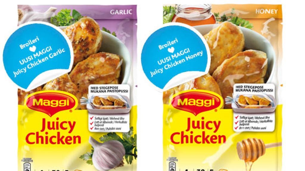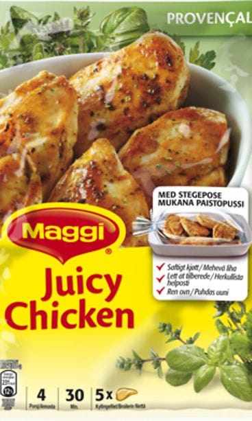 Kokeile veden kielelle tuovia uutuuksia! MAGGI Juicy Garlic on mehevä valkosipulinen broileriruoka ja MAGGI Juicy Honey lempeä, mehevän hunajainen broileriruoka. Testaa myös ennestään tutut maut: Pork Classic, Pork Paprika, Chicken Provencal. Tarjoillaan haluttujen lisäkkeiden ja tuoreiden vihannesten kanssa.