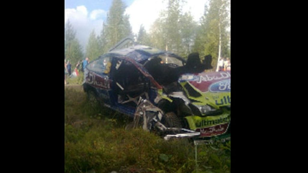 Auton massiivisten vaurioiden takia Hirvonen ei pysty jatkamaan kilpailua.