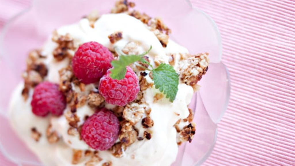 Jos taas haluat rakenteeltaan karkeajakoisempaa crunchya, käytä Iso Kaurahiutaletta. Lisää kauramurua marjavaahdon päälle. Katso videolta reseptin valmistus.