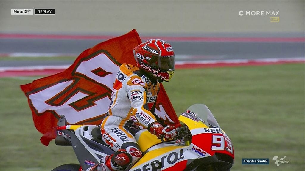 Marquez ohitti lähes koko ajan kisaa johtaneen Ducatin Danilo Petruccin upeasti viimeisellä kierroksella. Honda-kuljettaja teki peliliikkeensä heti Misanon radan ensimmäisessä mutkassa. Kolmanneksi kisassa ajoi Petruccin tallikaveri Andrea Dovizioso.