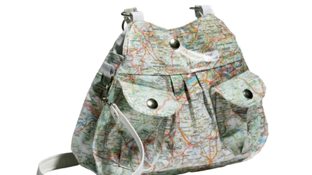 4. Kierrätetystä kartasta tehty laminoitu laukku 135 euroa, Secco.