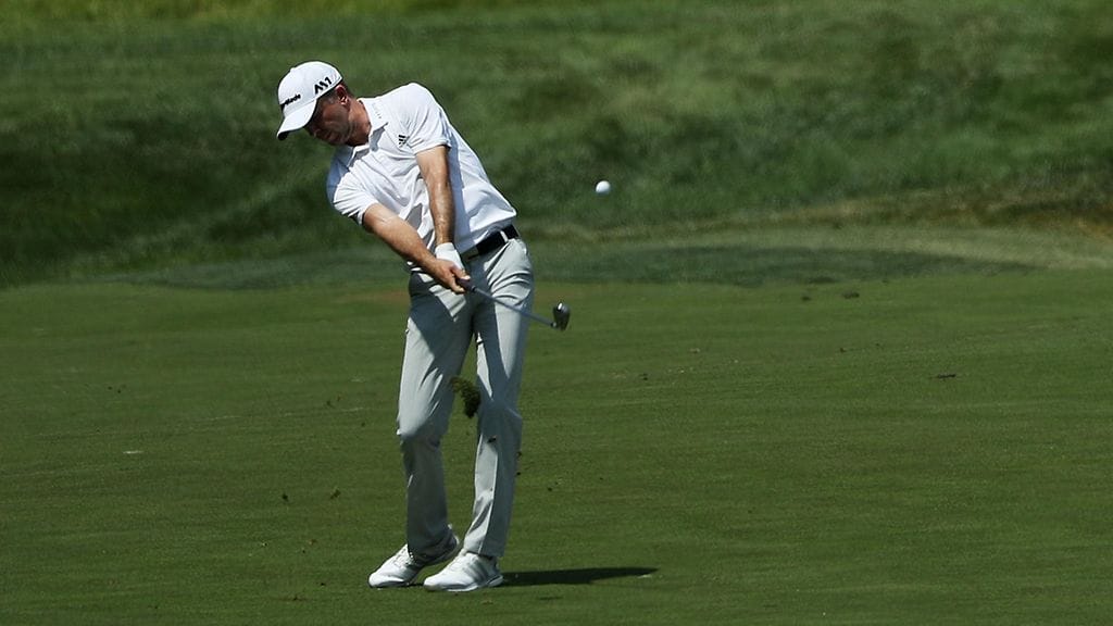 Keegan Bradley säväytti golfin PGA-kiertueen Quicken Loans National -turnauksessa kolmannella kierroksella.