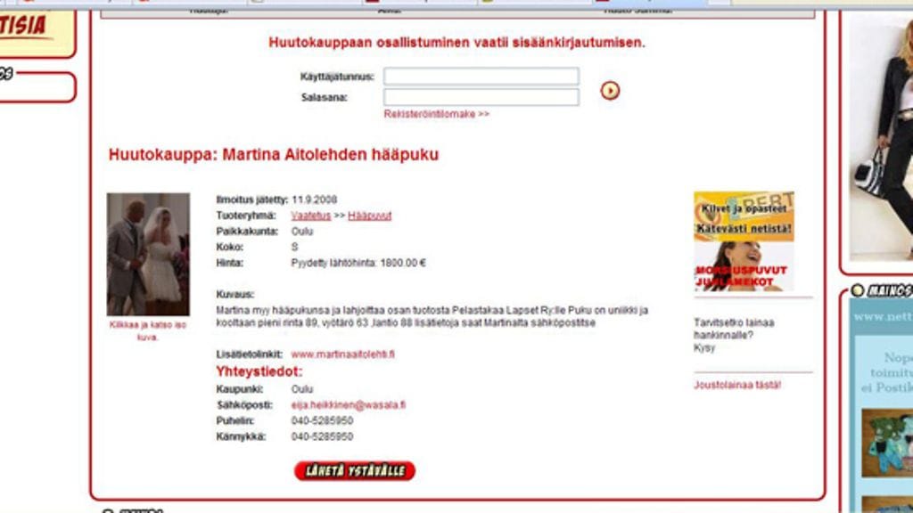 Martina Aitolehti myy nettikaupassa hääpukuaan. Hän lahjoittaa myyntituloista osan Pelastakaa Lapset ry.:lle.