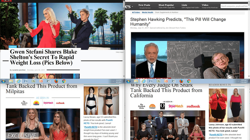 Näillä tuotteita mainostivat näennäisesti huijaussivuilla tunnetut henkilöt, kuten Stephen Hawking, Jennifer Lopez, Gwen Stefani, Blake Shelton, Wolf Blitzer, sekä Leijonan luola -televisiosarja.