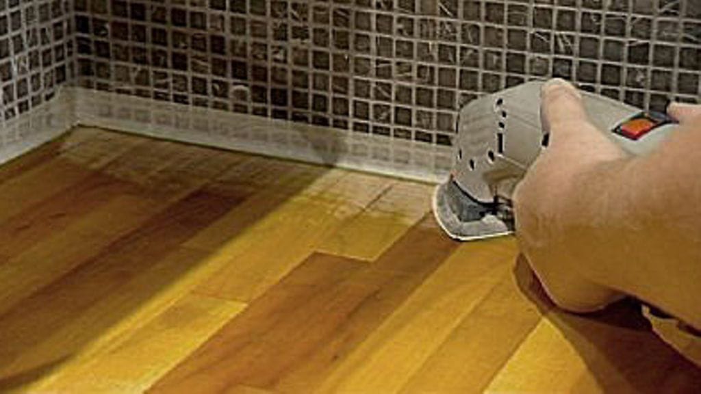 Tasojen hiomista käsin ei kannata edes ajatella – siinä menisi ikä ja terveys, eikä jälki ole silti missään suhteessa vaivannäköön. Sopivia koneita saa jokaisesta konevuokraamosta: tähän valittiin kaksi epäkeskotasohiomakonetta, joista isompaa, pyöreää käytettiin isojen pintojen hiomiseen ja pienempää kärkikolmiokonetta nurkkiin ja muihin ahtaampiin paikkoihin.