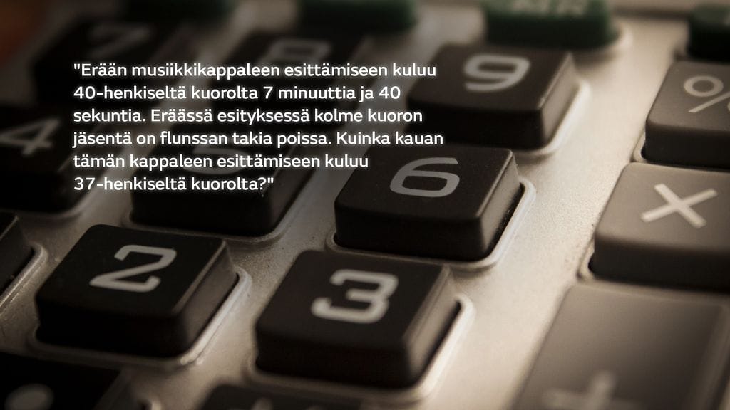 "Erään musiikkikappaleen esittämiseen kuluu 40-henkiseltä kuorolta 7 minuuttia ja 40 sekuntia. Eräässä esityksessä kolme kuoron jäsentä on flunssan takia poissa. Kuinka kauan tämän kappaleen esittämiseen kuluu 37-henkiseltä kuorolta?"
