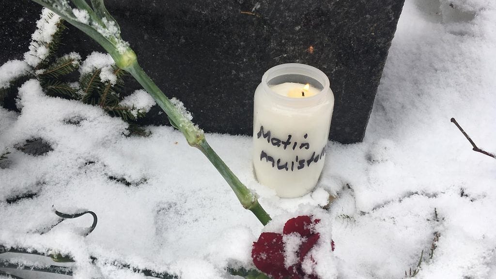 "Matin muistolle", sanotaan yhdessä kynttilässä. Enkelikynttilöitä on aseteltu hautakiven päälle valaisemaan harmaata, maaliskuista iltapäivää.