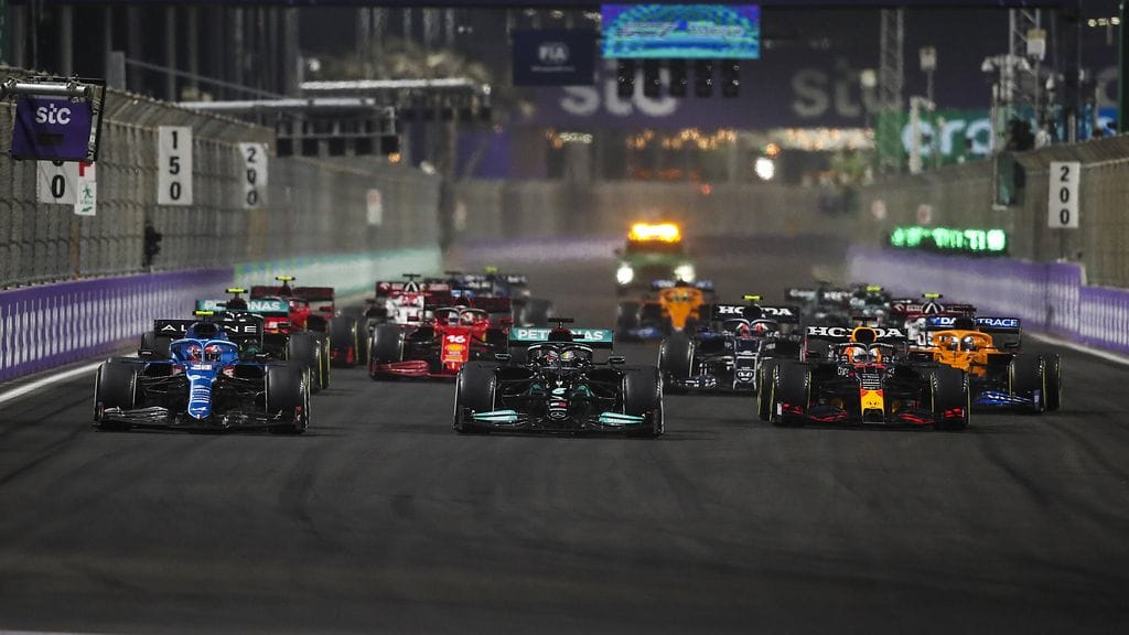 Red Bullin Max Verstappen otti hurjan uusintalähdön Saudi-Arabian GP:ssä, nousten ensimmäisessä mutkassa kolmannelta paikalta kärkeen.
