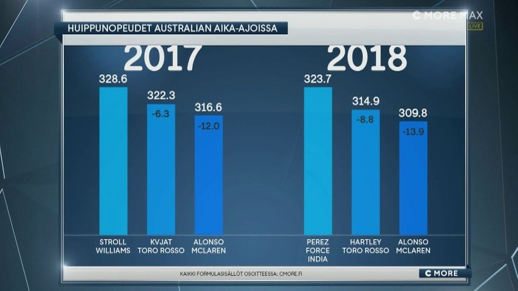 Viime kaudella Hondan moottoreilla ajaneen McLarenin huippunopeus Australian aika-ajoissa oli 316,6 kilometriä tunnissa, kun Williamsin Lance Stroll ajoi maksimissaan 328,6 kilometriä tunnissa.