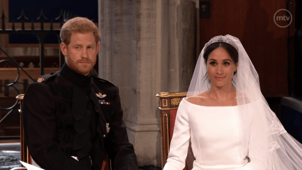 Meganilla on päässään edesmenneen prinsessa Maryn tiara. Hänen meikkinsä on luonnollinen ja hiuksensa nutturalla.
