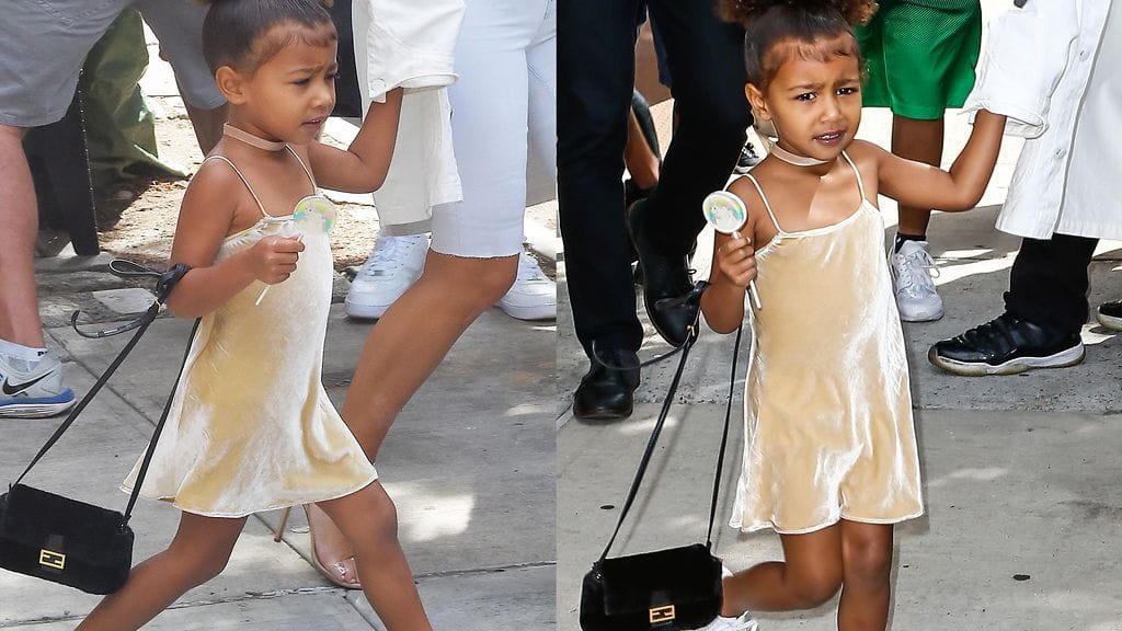 North oli pukeutunut spaghettiolkainmekkoon, samettiseen choker-kaulapantaan ja valkoisiin kenkiin. Tyylikäs tyttö kruunasi tyylinsä Fendin käsilaukulla.